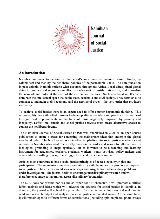 Welcome to the first edition of the Namibian Journal of Social Justice (NJSJ). We are proud to present this new journal and hope it will make a meaningful contribution to the debates on social and economic justice in Namibia. The background and motivation for this journal is the fact that Namibia continues to be one of the world’s most unequal nations caused, firstly, by colonialism and then by the neoliberal policies of the postcolonial State. The elite transition in post-colonial Namibia reflects what occurred throughout Africa. Local elites joined global elites to produce and reproduce intellectuals who seek to justify, rationalise, and normalise the neo-colonial order at the core of the current inequalities. Such neoliberal intellectuals dominate the intellectual space inside the state, academia and civil society. They form an elite compact to maintain their hegemony and the neoliberal order.